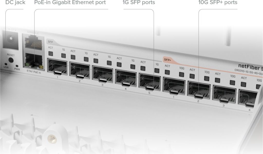 MikroTik netFiber 9 được thiết kế với 4 cổng SFP+ 10 Gbps, 5 cổng SFP 1Gbps, và cổng Gigabit Ethernet kết nối trực tiếp với chip chuyển đổi giúp bạn có thể tận hưởng tốc độ gigabit tối đa. Ngoài ra cổng này cũng hỗ trợ PoE-IN, giúp bạn có thể cấp nguồn cho thiết bị ở những nơi chật hẹp hoặc những vị trí khó tiếp cận nguồn điện.