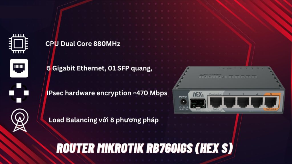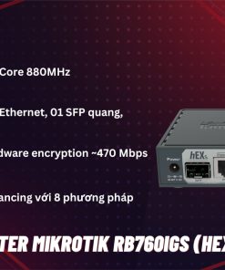 MikroTik RB760iGS (hEX S) là dòng thiết bị cân bằng tải chính hãng Mikrotik, được trang bị 5 cổng Gigabit Ethernet cùng một module quang học SFP cho tốc độ 1.25Gbps. Người dùng có thể cấu hình tối đa tới 4 mạng WAN khi sử dụng MikroTik RB760iGS. Trong 5 cổng RJ45 có 1 cổng hỗ trợ PoE in cấp nguồn cho thiết bị thông qua các dòng MikroTik Switch PoE, 1 cổng hỗ trợ PoE out để cấp nguồn từ thiết bị cho các thiết bị Camera IP, điện thoại IP…