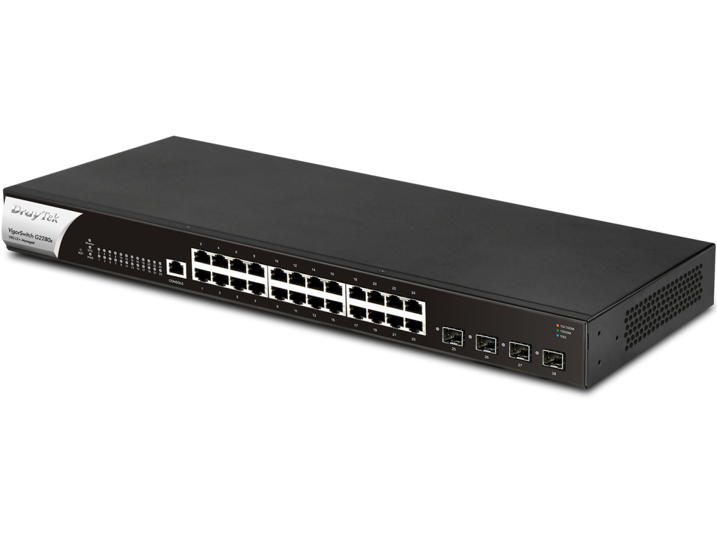 DrayTek VigorSwitch G2280x được thiết kế chuyên nghiệp với 24 cổng Gigabit, 4 cổng 1/10Gbps slot SFP+, qua đó đáp ứng nhu cầu truyền tải dữ liệu tốc độ cao. Thiết kế với vỏ bằng thép tạo cảm giác cứng cáp chắc chắn, những khe lưới bên sườn giúp tản nhiệt tăng tuổi thọ và hiệu năng cho thiết bị. Slot SFP+ 10GbE cho port Uplink DrayTek VigorSwitch G2280x có 4 Port slot SFP+ 10GbE dành riêng cho uplink, cho phép bạn tạo các liên kết băng thông cao đến Sever hoặc đến switch khác giảm tắt nghẽn trong hệ thống mạng của bạn.